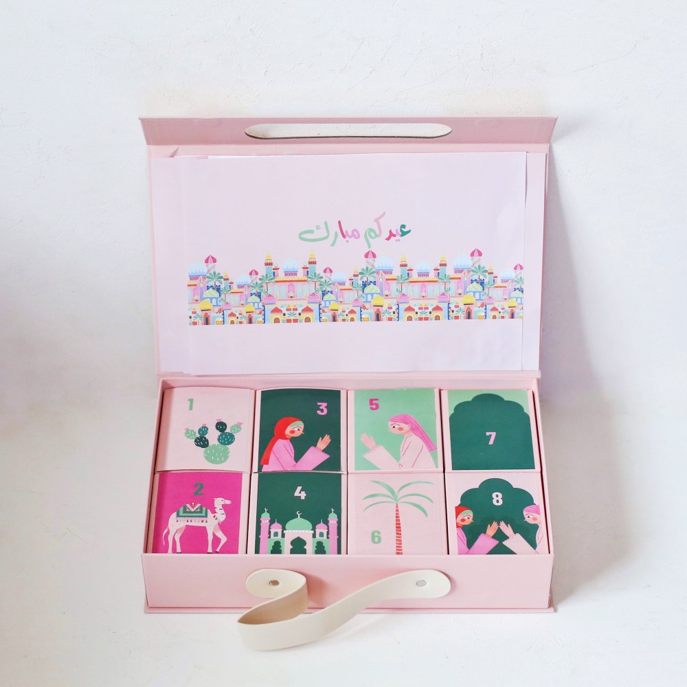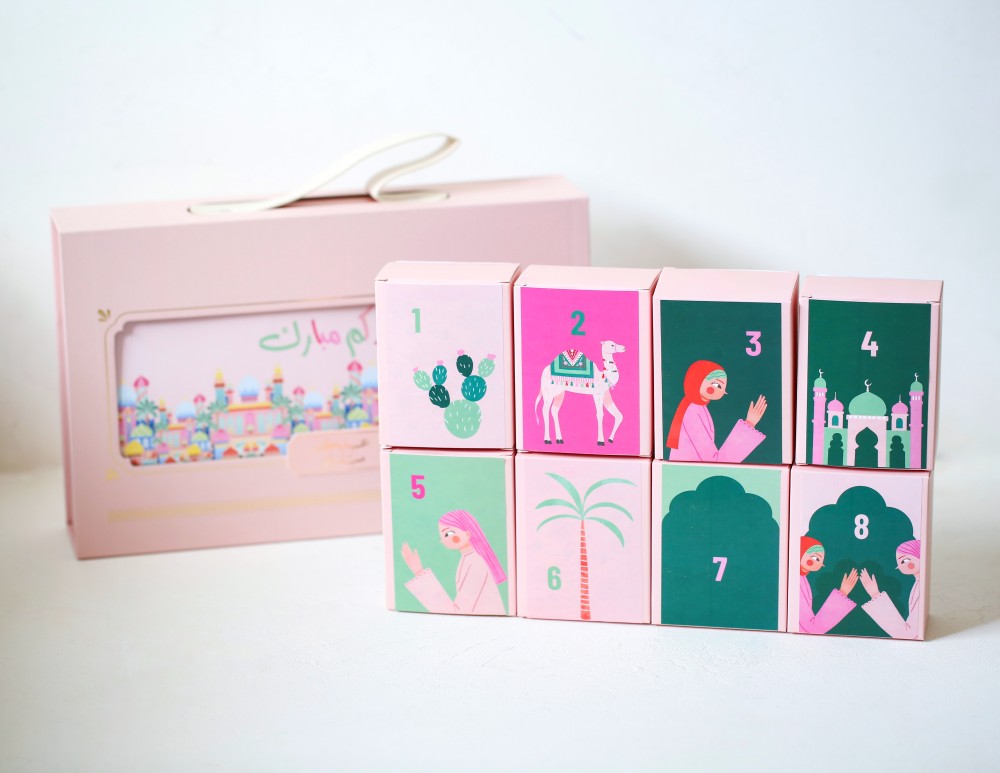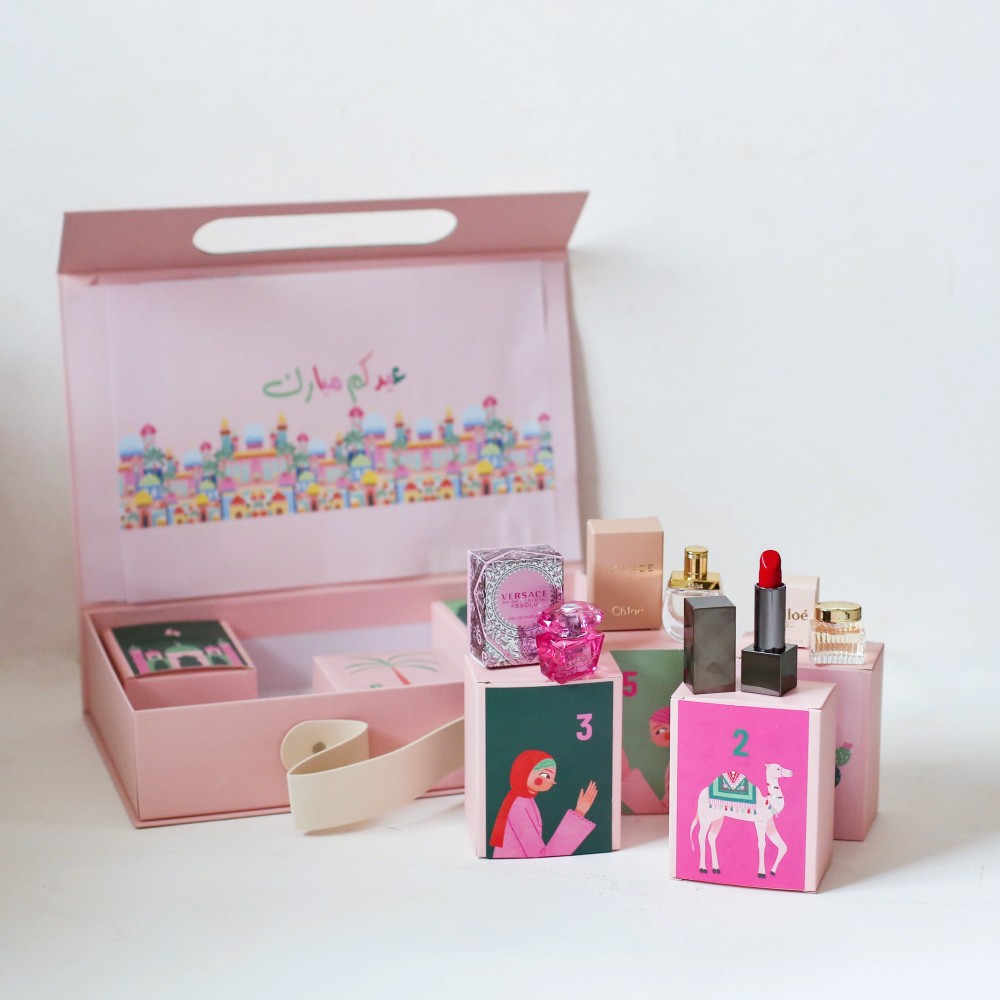 يحتوي الصندوق على ثمانية صناديق صغيرة، كل صندوق منها يحتوي على هدية مميزة ومختلفة من منتجاتنا الميني الاصلية.
